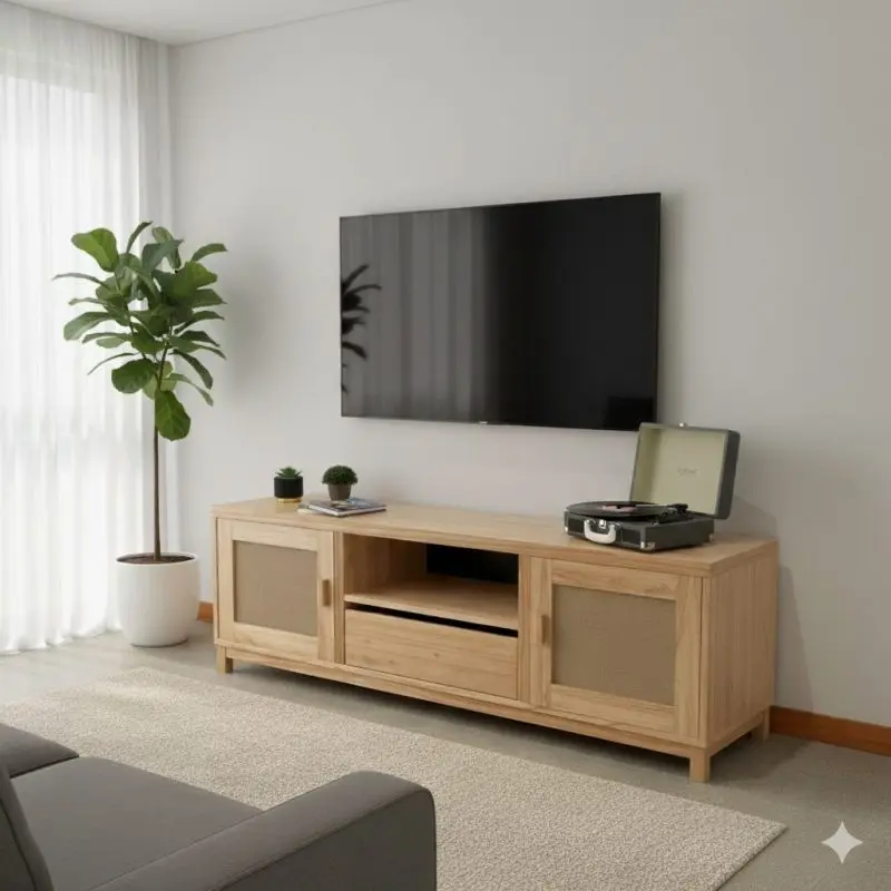 50% DE DESCUENTO ABONANDO CON TODOS LOS MEDIOS DE PAGOEste elegante rack para TV combina la calidez del enchapado en Paraiso con un diseño moderno y funcional. Las puertas de arpillera añaden un detalle texturizado que complementa perfectamente la madera, creando un contraste visual atractivo.Con amplios compartimentos para almacenar dispositivos multimedia y espacio para la decoración, este rack no solo es práctico, sino que también se convierte en un elemento decorativo que realza la estética de tu living. Ideal para quienes buscan un mobiliario que combine estilo y funcionalidad.