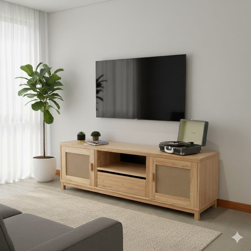 Este elegante rack para TV combina la calidez del enchapado en Paraiso con un diseño moderno y funcional. Las puertas de arpillera añaden un detalle texturizado que complementa perfectamente la madera, creando un contraste visual atractivo.