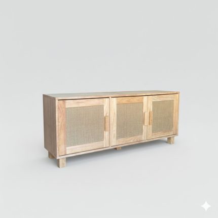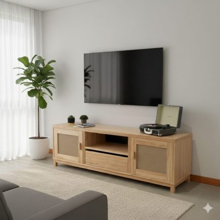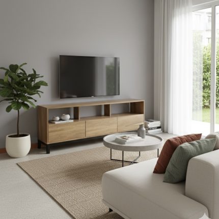 La madera clara es esencial en el rack TV nórdico por su capacidad de difundir luminosidad y potenciar la amplitud visual del espacio.• Estética: La tonalidad clara de la madera genera una estética limpia y contemporánea.